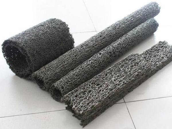 塑料盲溝是由塑料芯體外包裹濾布組式。塑料芯體是以熱可塑性合成樹脂為主要原料,經(jīng)過改性,在熱熔狀態(tài)下,通過噴咀擠壓出細(xì)的塑料絲條,再通過成型裝置將擠出的塑料絲在結(jié)點上熔接,形成三維立體網(wǎng)狀結(jié)構(gòu)。